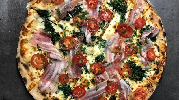 Mozzarella, pancetta, salsiccia, špenát, sýr Grana