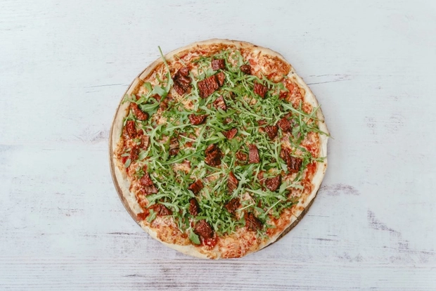pomodoro, mozzarella, salám Spianata, rucola, sušená rajčata